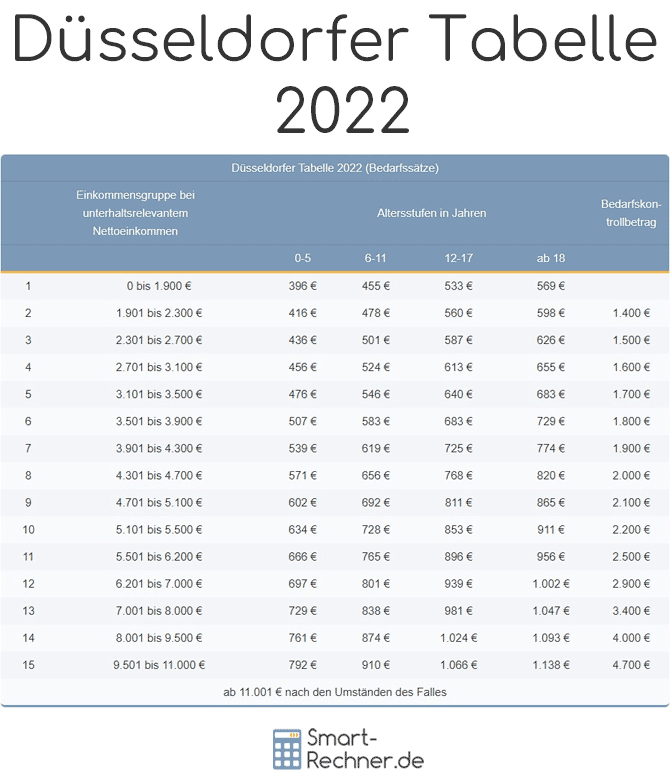 Die folgende Düsseldorfer Tabelle 2022 weist abhängig von der Einkommensgruppe und dem Alter des Kindes den monatlichen Unterhaltsbedarf 2022 der unterhaltsberechtigten Kinder aus. Der Bedarf ist allerdings nicht identisch mit dem Zahlbetrag, was im weiteren erläutert wird.