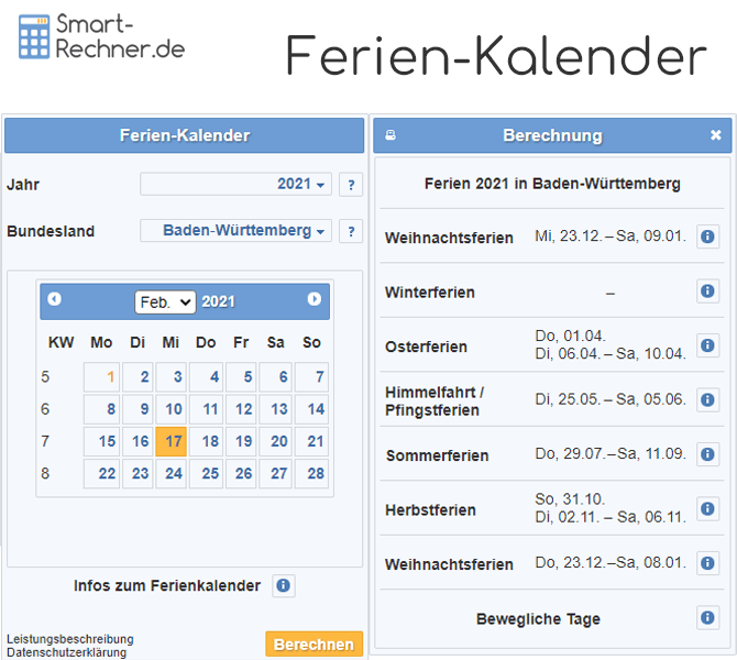Ferienrechner - Ferien in Kalenderansicht und in Tabelle
