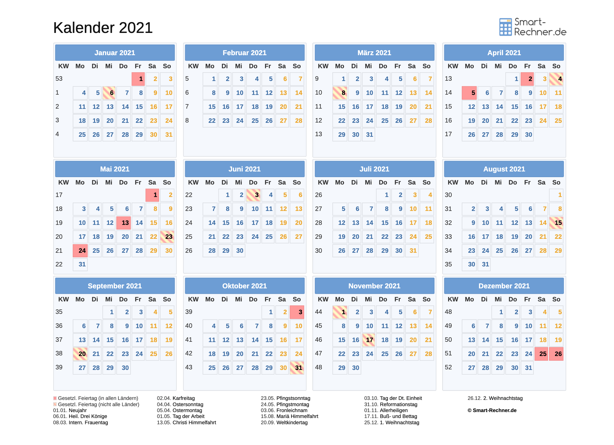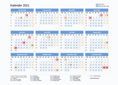 Laden und drucken Sie den Kalender 2021 mit allen gesetzlichen Feiertagen 2021 in den Dateiformaten PDF oder PNG. Den ausdruckbaren Kalender 2021 können Sie auch in Ihrer Website oder einer anderen Publikation veröffentlichen. Dann muss Smart-Rechner.de verlinkt sein sowie als Quelle angegeben sein.