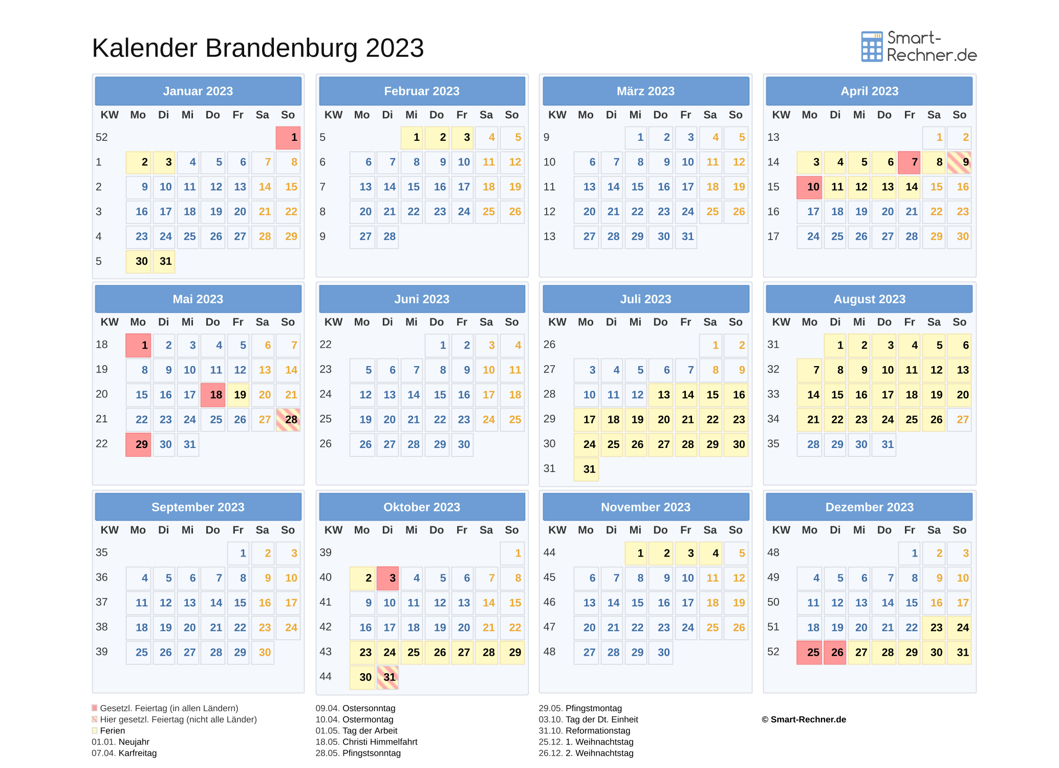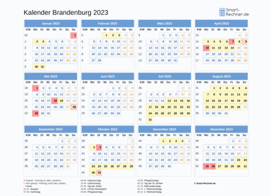 Laden und drucken Sie die Kalender 2022 und 2023 für Brandenburg mit allen gesetzlichen Feiertagen 2022 bzw. Feiertagen 2023 und Ferien in Brandenburg in den Dateiformaten PDF oder PNG. Die ausdruckbaren Kalender können Sie auch in Ihrer Website oder einer anderen Publikation veröffentlichen. Dann muss Smart-Rechner.de verlinkt sein sowie als Quelle angegeben sein.