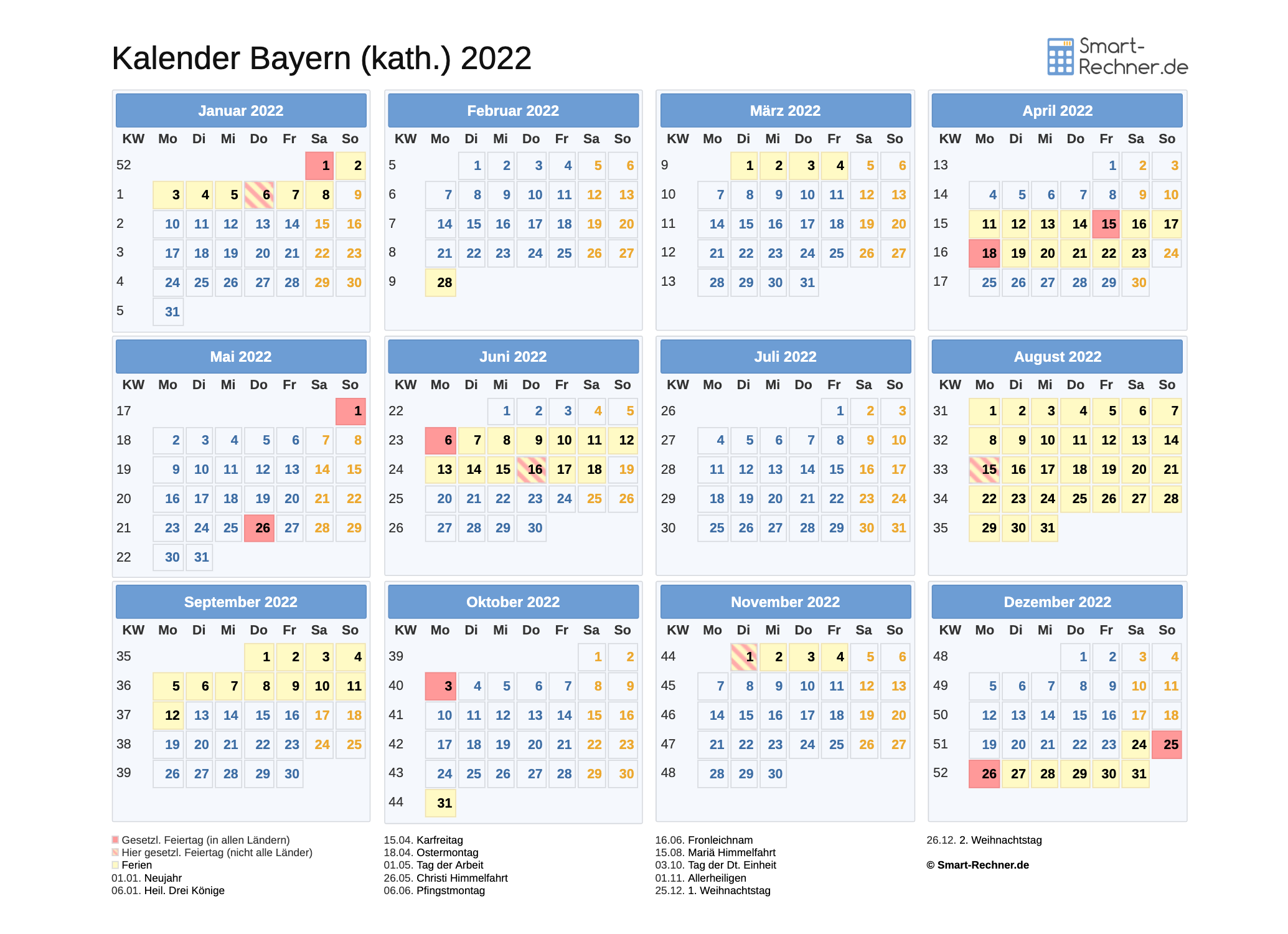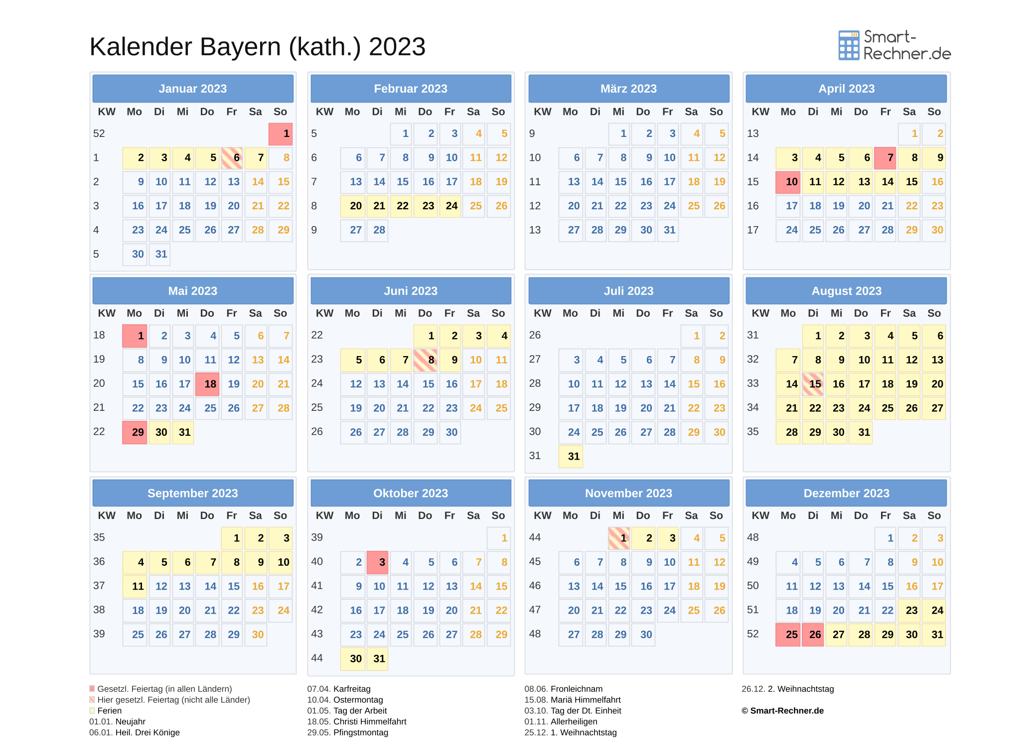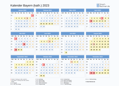 Laden und drucken Sie die Kalender 2022 und 2023 für Bayern (kath.) mit allen gesetzlichen Feiertagen 2022 bzw. Feiertagen 2023 und Ferien in Bayern (kath.) in den Dateiformaten PDF oder PNG. Die ausdruckbaren Kalender können Sie auch in Ihrer Website oder einer anderen Publikation veröffentlichen. Dann muss Smart-Rechner.de verlinkt sein sowie als Quelle angegeben sein.