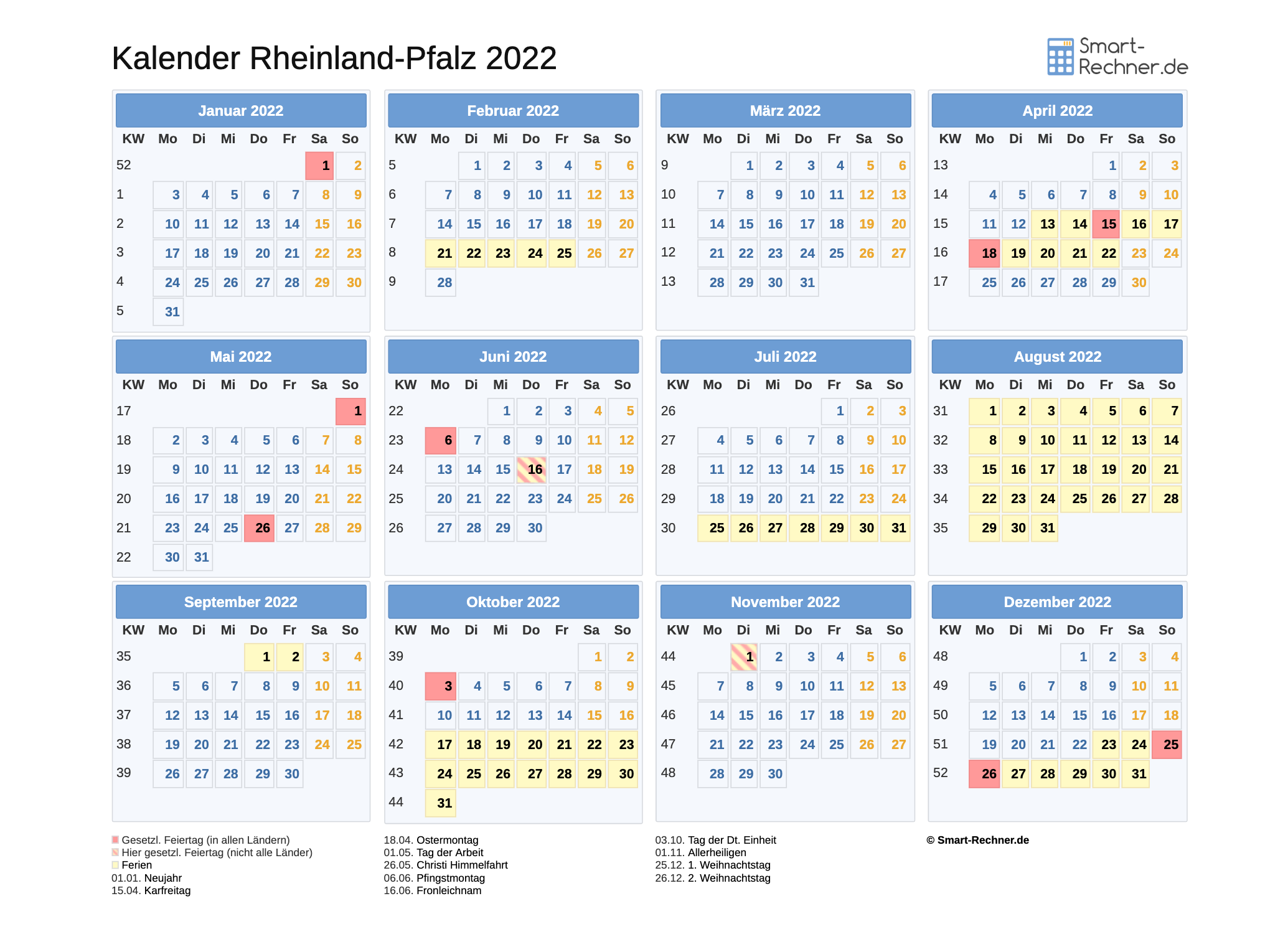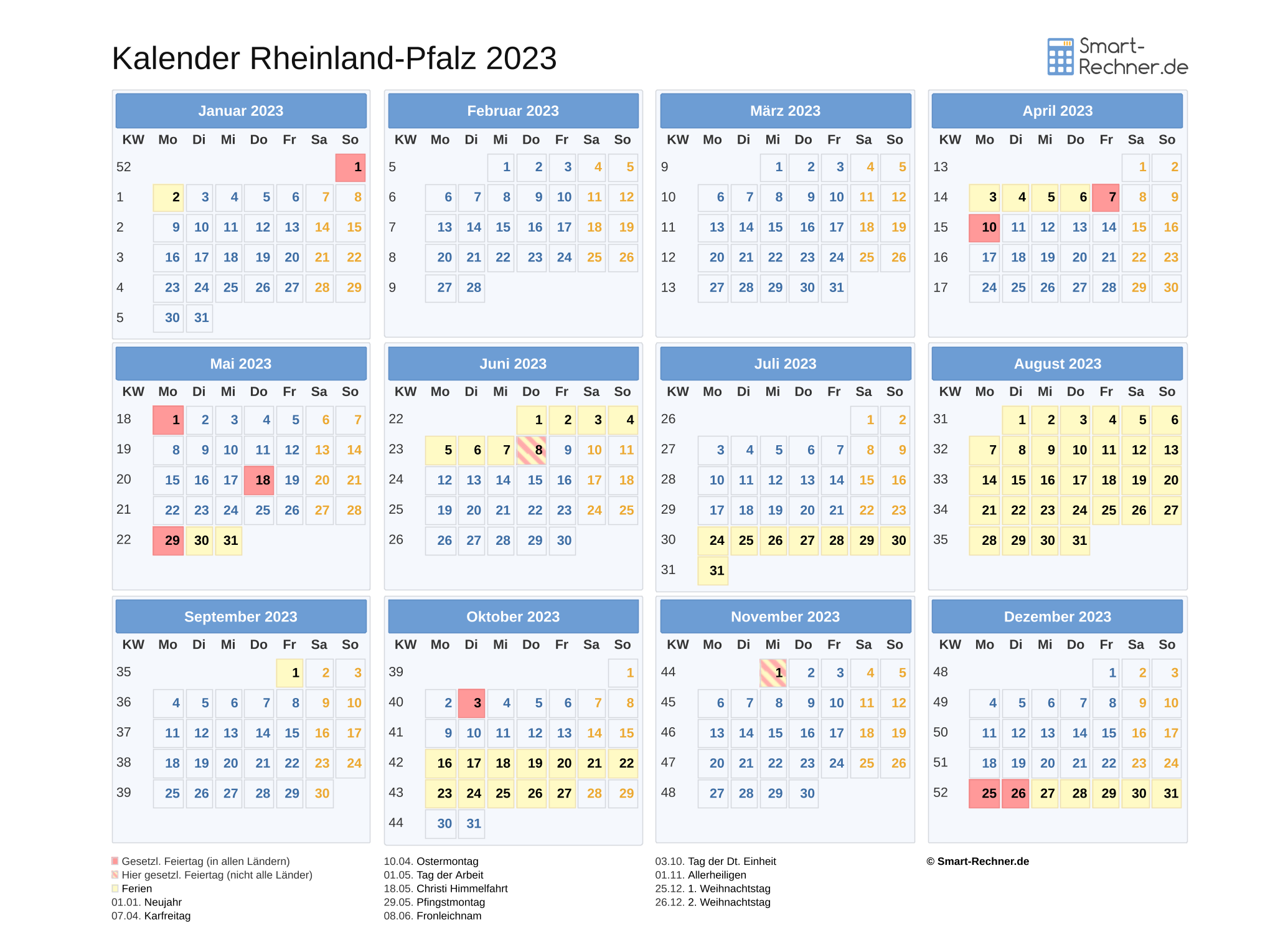 Laden und drucken Sie die Kalender 2022 und 2023 für Rheinland-Pfalz mit allen gesetzlichen Feiertagen 2022 bzw. Feiertagen 2023 und Ferien in Rheinland-Pfalz in den Dateiformaten PDF oder PNG. Die ausdruckbaren Kalender können Sie auch in Ihrer Website oder einer anderen Publikation veröffentlichen. Dann muss Smart-Rechner.de verlinkt sein sowie als Quelle angegeben sein.