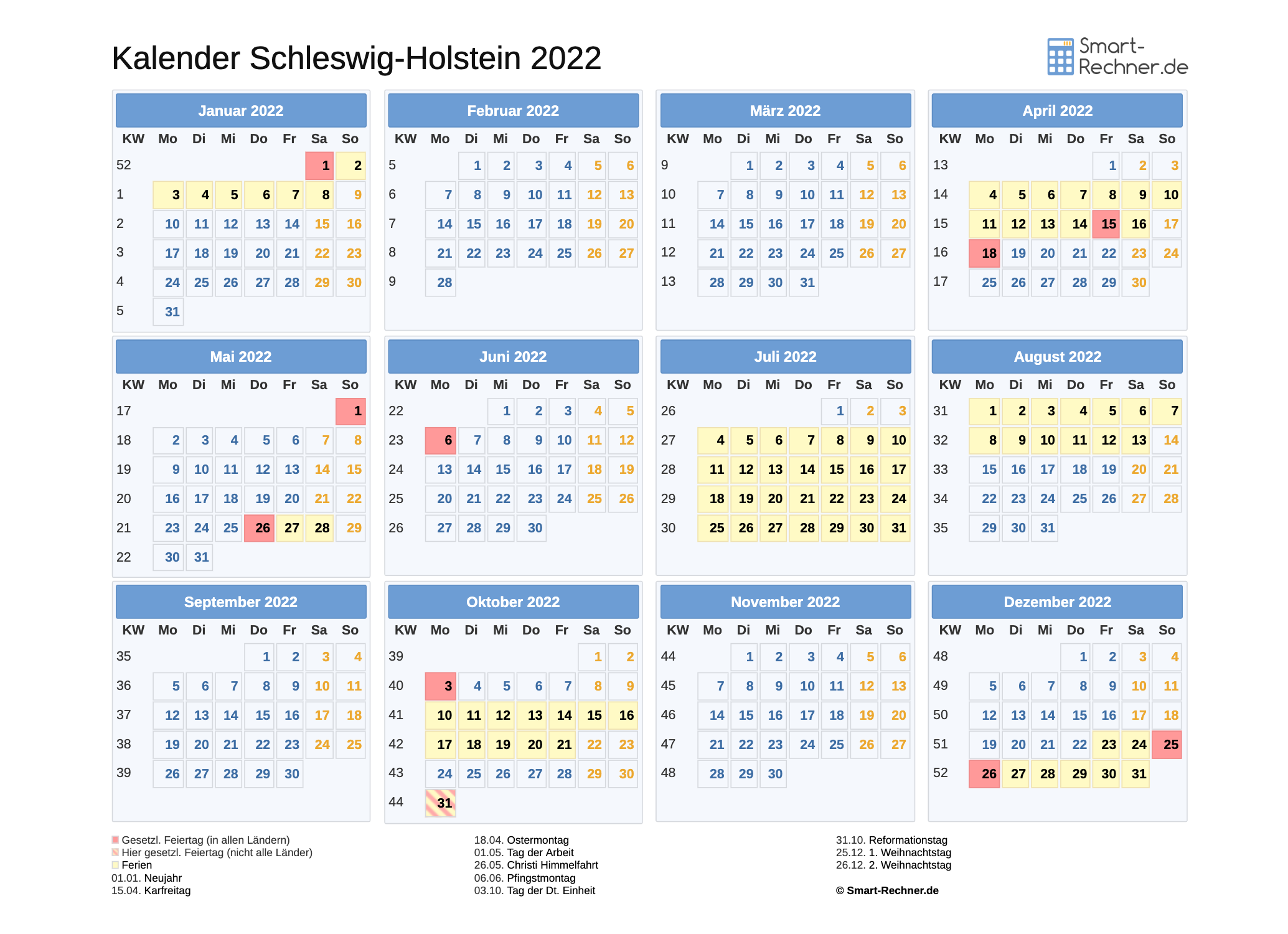- Druckbarer Kalender 2022 für Schleswig-Holstein zum Download im PDF-Format