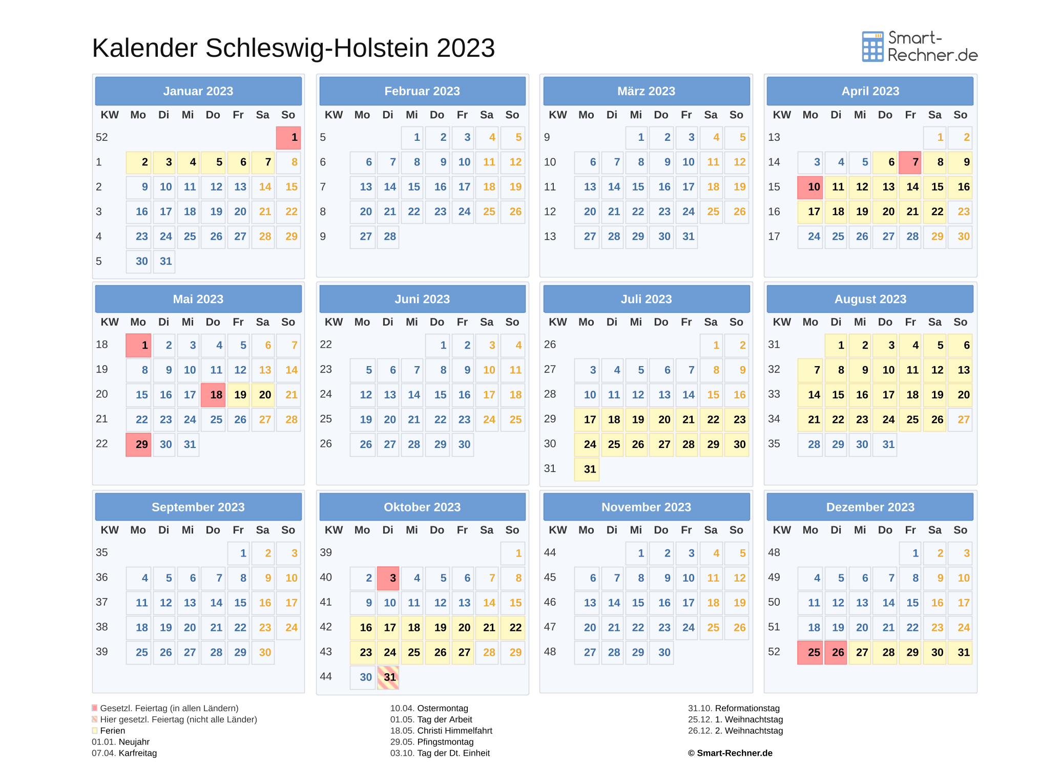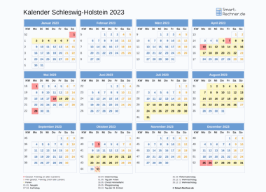 Laden und drucken Sie die Kalender 2022 und 2023 für Schleswig-Holstein mit allen gesetzlichen Feiertagen 2022 bzw. Feiertagen 2023 und Ferien in Schleswig-Holstein in den Dateiformaten PDF oder PNG. Die ausdruckbaren Kalender können Sie auch in Ihrer Website oder einer anderen Publikation veröffentlichen. Dann muss Smart-Rechner.de verlinkt sein sowie als Quelle angegeben sein.