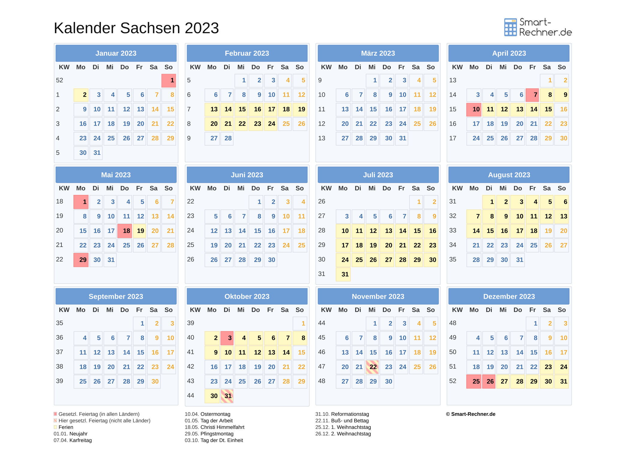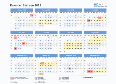 Laden und drucken Sie die Kalender 2022 und 2023 für Sachsen mit allen gesetzlichen Feiertagen 2022 bzw. Feiertagen 2023 und Ferien in Sachsen in den Dateiformaten PDF oder PNG. Die ausdruckbaren Kalender können Sie auch in Ihrer Website oder einer anderen Publikation veröffentlichen. Dann muss Smart-Rechner.de verlinkt sein sowie als Quelle angegeben sein.