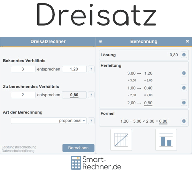 Was ist der Dreisatz? Wie rechnet man mit dem Dreisatz? Hier erhalten Sie Antworten auf diese und weitere Fragen und viele Beispiele zum Dreisatz. Anhand des Dreisatzrechners können Sie zwei gegebene Werte für ein bekanntes Verhältnis sowie den gegebenen Wert für das zu berechnende Verhältnis eingeben. Der Dreisatzrechner berechnet den gesuchten Wert, abhängig davon, ob das Verhältnis eine proportionale oder eine antiproportionale Zuordnung ist.