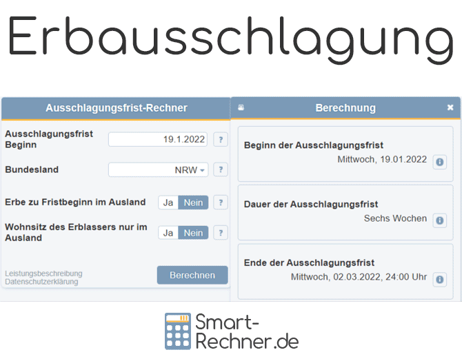 Will man eine Erbschaft nicht antreten, so muss man diese ausdrücklich beim Nachlassgericht ausschlagen. Dies ist beispielsweise dann ratsam, wenn abzusehen ist, dass die Erbschaft größtenteils aus Verbindlichkeiten besteht. Zur Ausschlagung der Erbschaft ist eine Frist, die sogenannte Ausschlagungsfrist bzw. Erbausschlagungsfrist einzuhalten. Diese Frist zur Abgabe der Erbausschlagung können Sie hier online mit dem Ausschlagungsfrist-Rechner berechnen. Nach Angabe des Datums für den Fristbeginn berechnet der Rechner das Fristende zur Abgabe der Ausschlagung an das Nachlassgericht. Hierbei wird der letzte Wohnsitz des Erblassers sowie der Aufenthaltsort des Erbes ebenso, wie Wochenenden und gesetzliche Feiertage für die Berechnung berücksichtigt.