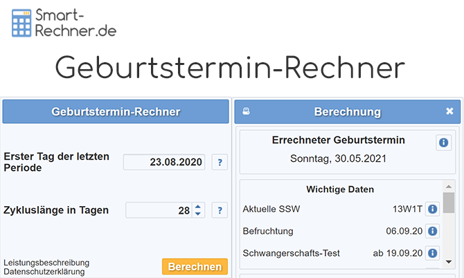 Zyklus mit unserem Geburtstermin-Rechner. Die Ausgabe zahlreicher weiterer Daten,