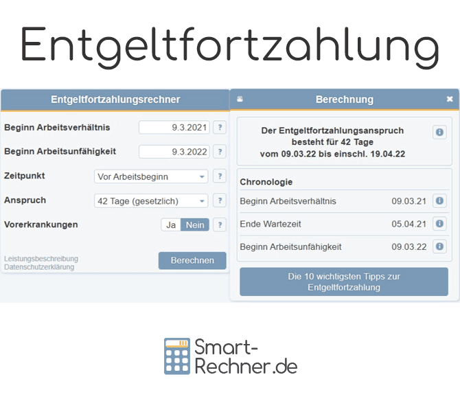 Die Berechnung von Dauer und Zeitraum der Entgeltfortzahlung bzw. Lohnfortzahlung im Krankheitsfall ist nicht trivial. Der Entgeltfortzahlungsrechner berücksichtigt zur Berechnung des exakten Zeitraums unter anderem aneinander anschließende Vorerkrankungen, die Wartezeit nach Beginn des Arbeitsverhältnisses, sowie die 6-Monats-Frist und die 12-Monats-Frist bei wiederholter Arbeitsunfähigkeit. Auch über das Entgeltfortzahlungsgesetz hinausgehende Regelungen zum Anspruch auf Entgeltfortzahlung können berechnet werden.