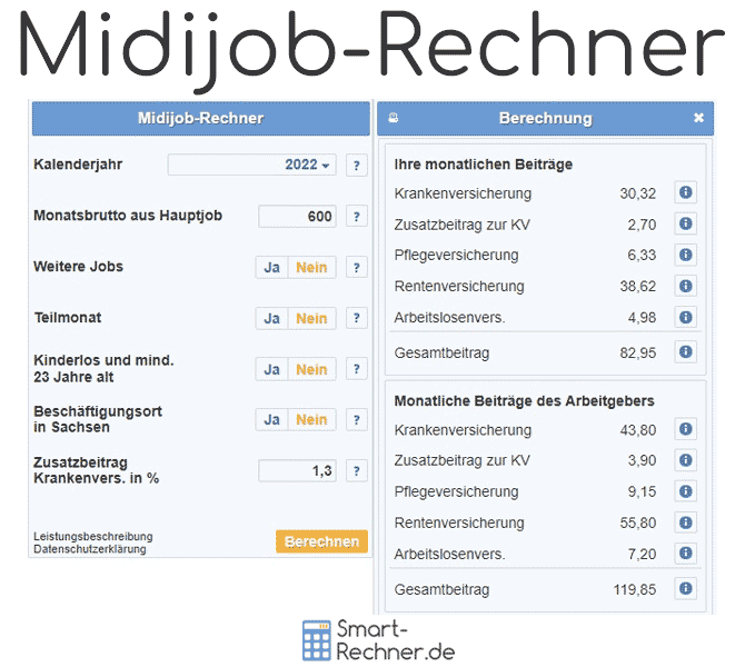 Der Midijob-Rechner unter https://www.smart-rechner.de/midijob/rechner.php berechnet ausnahmslos die monatlichen Sozialversicherungsbeiträge, welche in der Gleitzone zwischen 450 und 1.300 Euro einer gesonderten Berechnung unterliegen, die zu geringeren Beiträgen führt. Der Rechner verzichtet zur einfachen Handhabung und der Übersichtlichkeit halber daher auf zahlreiche Eingabefelder, wie Geburtsjahr, Kinderfreibeträge, Steuerklasse, Arbeitsort, Rentenversicherungspflicht u.v.a., welche zur Berechnung der Lohnsteuer erforderlich wären.