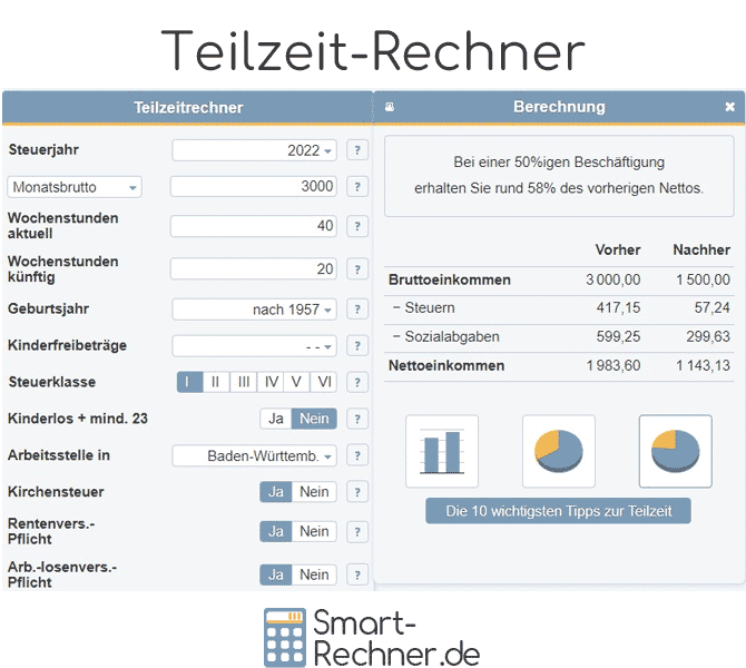 Teilzeitstelle wirklich leisten. Verwenden Sie unseren einfachen Teilzeit-Rechner, um die finanziellen Auswirkungen auf Ihren Nettolohn zu simulieren.