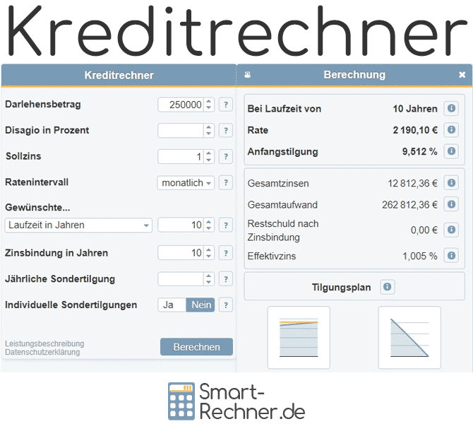 vielen Dank für Ihre Hinweise und Ihr positives Feedback. Kann es sein, dass Sie in unserem Kreditrechner unter https://www.smart-rechner.de/kredit/rechner.php übersehen haben, dass neben der gewünschten Laufzeit in Jahren unter „Gewünschte…“ noch zwei weitere Auswahlmöglichkeiten bestehen? Dort können Sie „Rate in Euro“ bzw. „Tilgung in Prozent“ auswählen, um genau diese Werte berechnen zu lassen. Zudem können Sie im dritten Eingabefeld einen Zinssatz angeben.