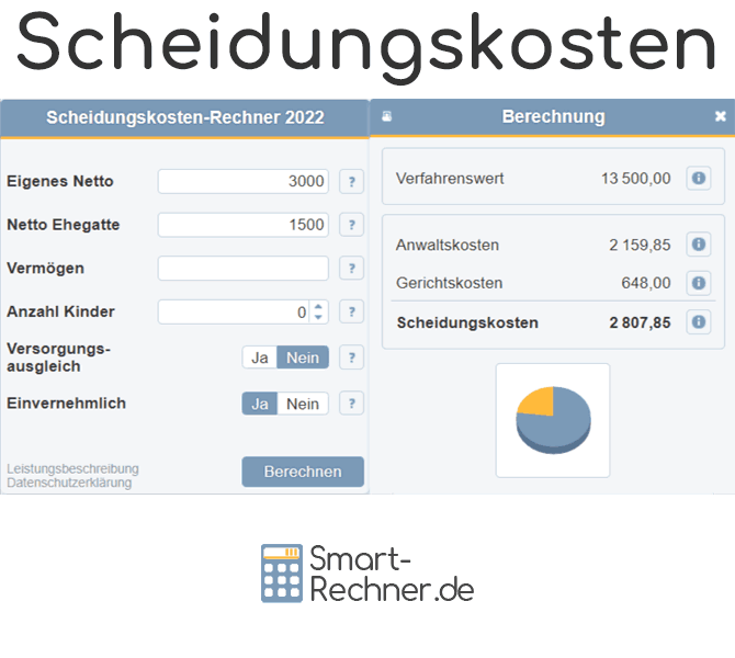Der Scheidungskosten-Rechner berechnet sowohl die Anwalts- als auch die Gerichtskosten, aus denen sich die Scheidungskosten zusammen setzen. Dabei wird zunächst der Verfahrenswert bestimmt, der als Berechnungsgrundlage für die zu berechnenden Kosten dient. Basis für die Kostenberechnung ist das Rechtsanwaltsvergütungsgesetz (RVG) sowie das Gesetz über Gerichtskosten in Familiensachen (FamGKG).