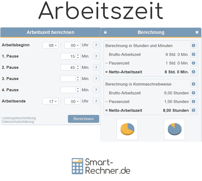 Mit dem Arbeitszeitrechner können Sie anhand Ihrer Angaben zu Arbeitsbeginn und Arbeitsende sowie der Länge Ihrer Arbeitspausen Ihre tägliche Arbeitszeit berechnen. Der Arbeitszeitrechner berechnet dabei Ihre Bruttoarbeitszeit inklusive Pausen sowie Ihre Nettoarbeitszeit, also Ihre reine Arbeitszeit ohne Pausen. Die berechneten Zeiten werden sowohl in Stunden und Minuten als auch in Dezimalangaben, also z.B. 7,5 Stunden berechnet. So ist es einfacher, Arbeitszeiten zu addieren.