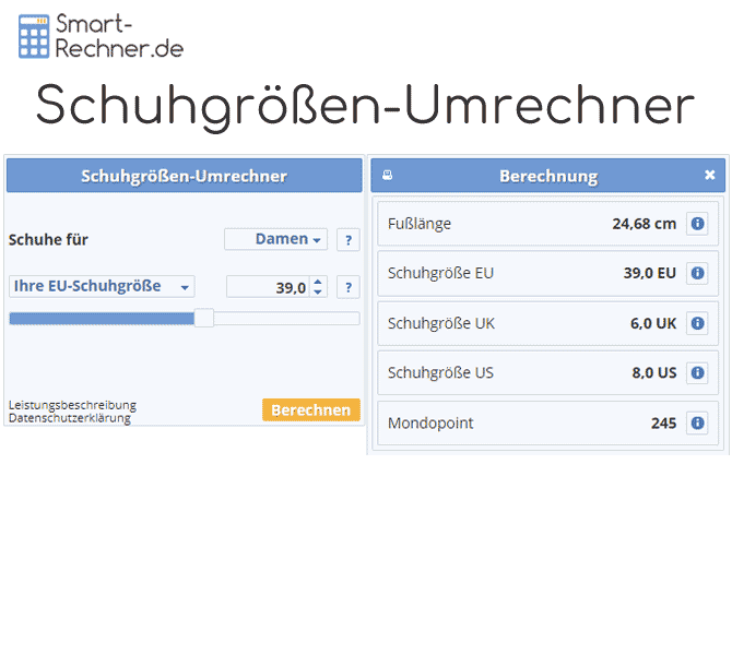 Mit dem Schuhgrößen-Umrechner können Sie beliebige Schuhgrößen umrechnen. Der Rechner eignet sich für die Umrechnung sowohl von Damenschuhgrößen, Herrenschuhgrößen und Kinderschuhgrößen sowie Babyschuhgrößen. Dabei werden die gängigen Größensysteme, nämlich EU-Schuhgrößen, UK-Schuhgrößen, US-Schuhgrößen und auch Mondopoint-Größen umgerechnet.