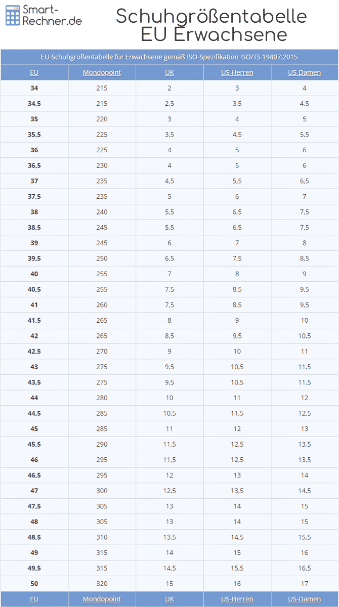 Die folgende Größentabelle für Schuhe basiert auf den ISO-Berechnungsformeln für Schuhgrößen.