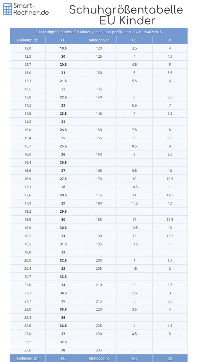 - Einige Schuhgrößentabellen berücksichtigen bei Kindergrößen bereits einen zusätzlichen Spielraum für das Wachstum der Füße, andere nicht