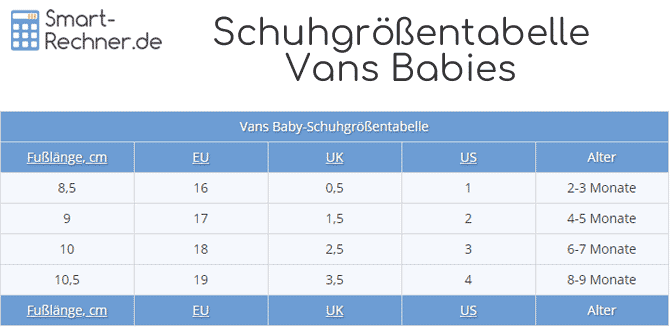 Diese Schuhgrößentabelle zeigt Ihnen die original Vans Größentabelle für Babies.