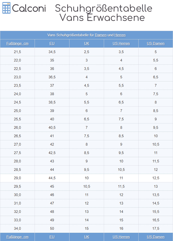 Vans Größentabelle für Damen Und Herren zum Ausdrucken