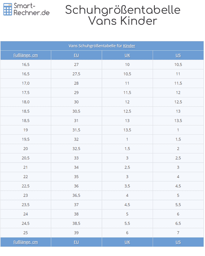 Dieser Ratgeber informiert Sie über die Vans Schuhgrößentabelle zur Umrechnung von EU-Größen, UK-Größen, US-Größen und Fußlänge. Die Größen der Vans Schuhe fallen anders aus, als die Schuhgrößen nach ISO, die unser Schuhgrößenrechner als Grundlage zur Umrechnung von Schuhgrößen verwendet. Daher veröffentlicht Vans eine eigene Umrechnungstabelle für die Vans-Schuhgrößen, so dass vor allem online die richtige Schuhgröße gefunden werden kann. Im folgenden präsentieren wir Ihnen die Vans Schuhgrößentabelle unisex, also für Herren und Damen, sowie die gesonderte Vans-Schuhgrößentabelle für Kinder, so wie sie unter anderem international von Amazon veröffentlicht werden.