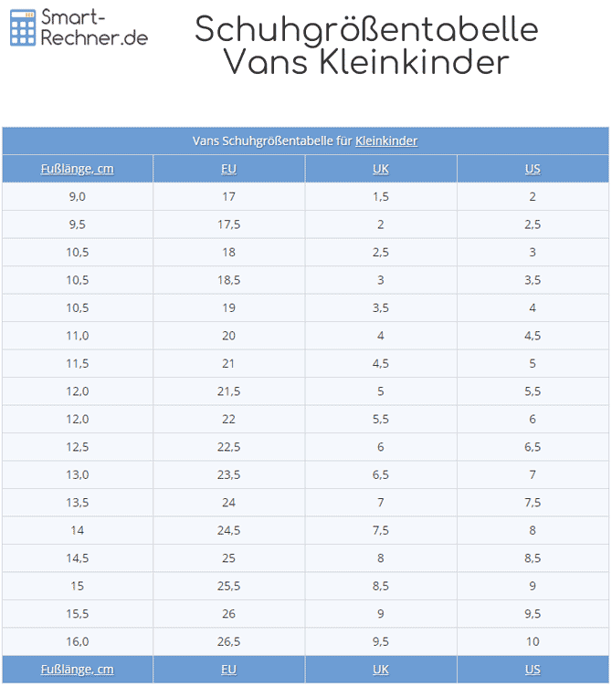 | Vans Schuhgrößentabelle für Kinder | |||