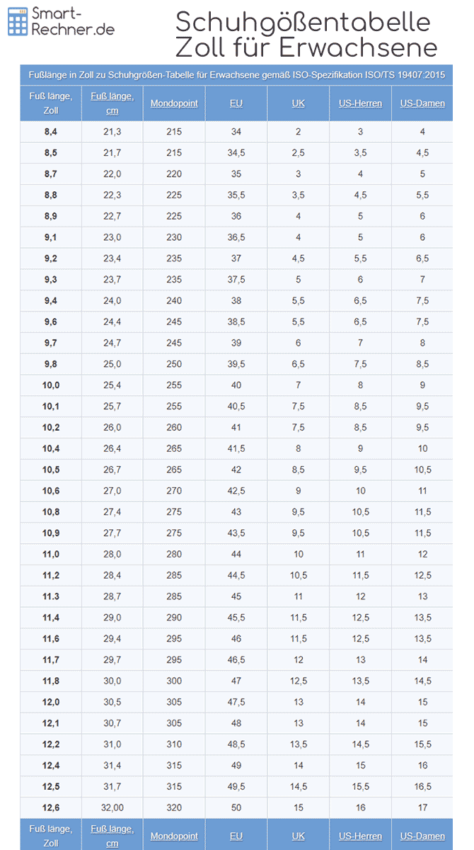 Schuhgrößentabelle zur Umrechnung der Fußlänge in Zoll für Erwachsene