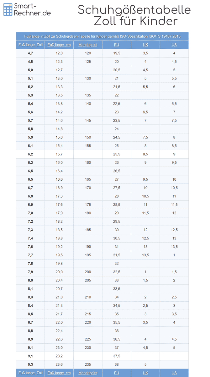 Bei den Umrechnungsformeln für Kinder wird im Unterschied zu den Erwachsenengrößen die Zehenfreiheit etwas anders berechnet. Es wird bei Kindern kein Aufschlag von zwei Schuhgrößen, sondern ein Aufschlag von acht Prozent der Fußlänge in Zoll verwendet. Zudem sind sowohl im UK- als auch im US-System Kindergrößen anders nummeriert als die Größen für Erwachsene. Im Anschluss an 13 Kindergrößen folgen in UK und US erst die mit 0 oder 1 beginnenden Größen für Erwachsene. Anhand der ISO-Spezifikation wird damit die folgende Schuhgrößentabelle für alle Kinderschuhgrößen empfohlen.